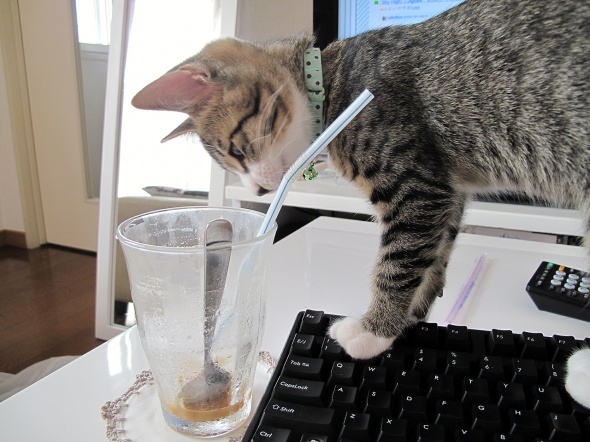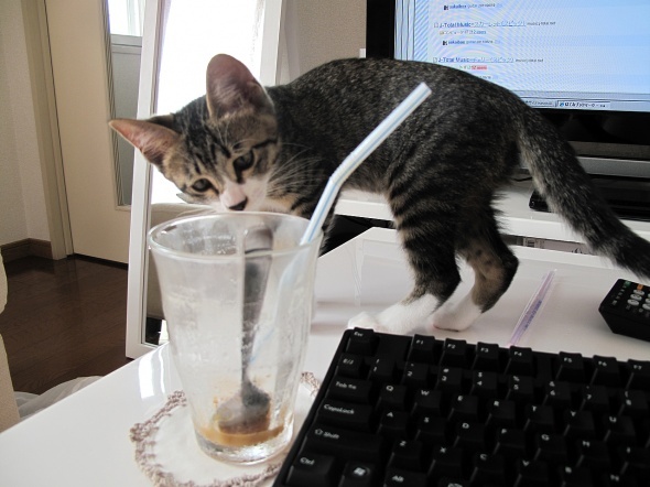 我が家の警備課長が、飲み終わったコーヒーフロートを発見しました!