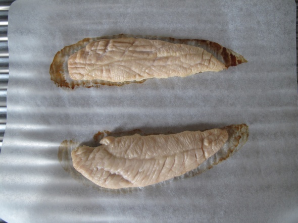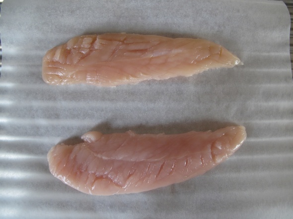 とりあえず、筋を取ったササミを叩いて平たくします