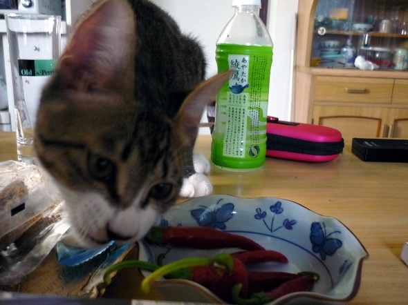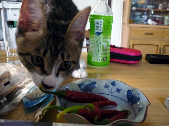 頂き物の唐辛子が気になる様子・・・