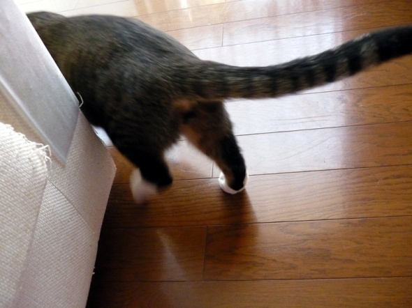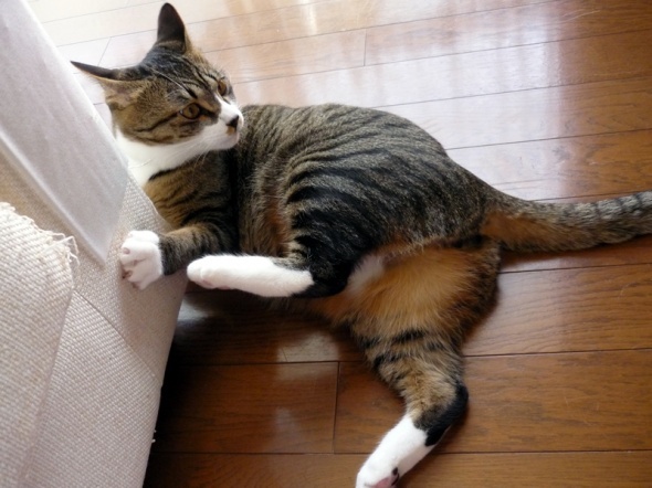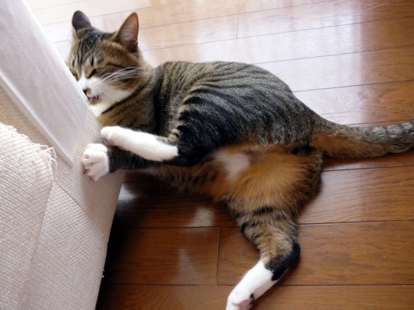ソファーに貼っている、爪とぎ防止シートと戦っている半蔵