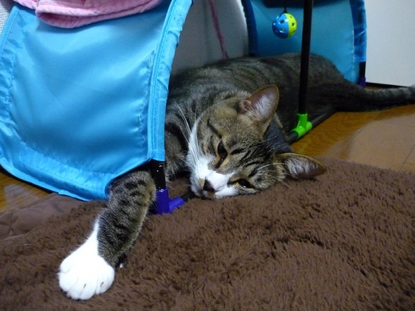 こたつに潜って寝ていた半蔵ですが、暑くなったらしく床で寝なおしています