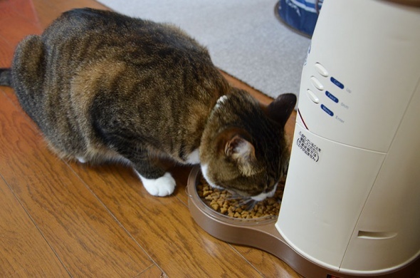 朝食中の半蔵ですが、今日から頻尿の薬スタートです(;´д`)