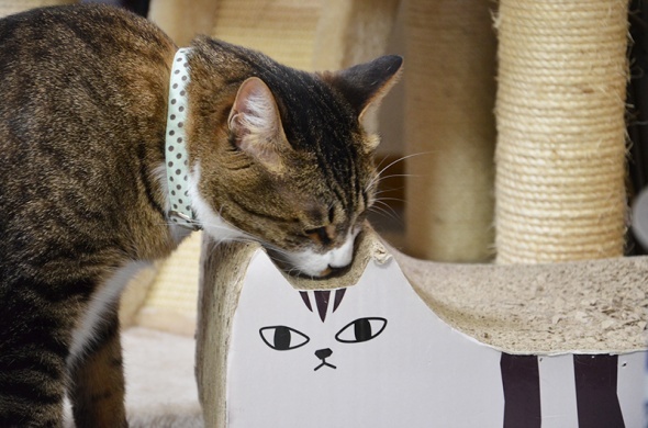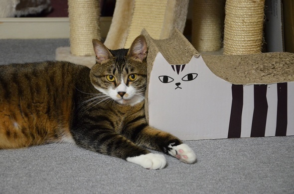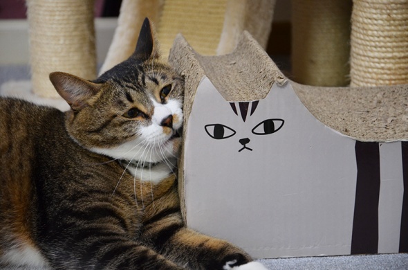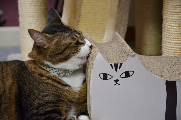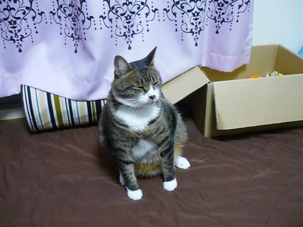 もうボロボロの爪とぎに寄りかかってくつろぐ半蔵です