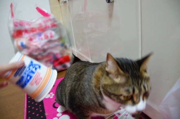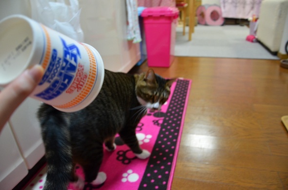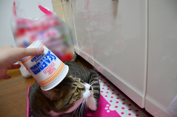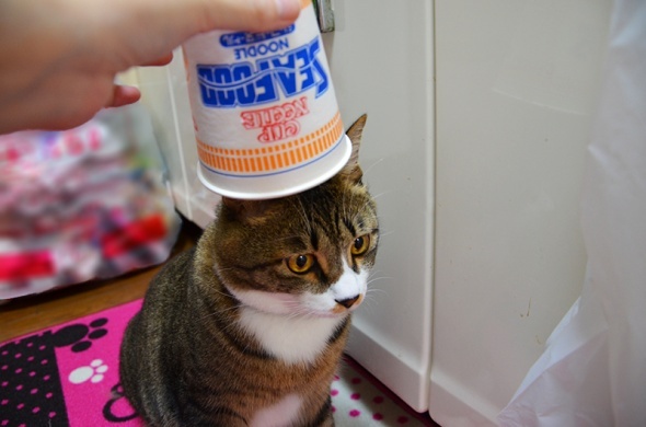 食べ終わった容器を半蔵にかぶせてみたくなったので、洗って乾かしました