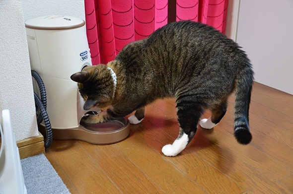 このように自動給餌機を揺するくらいご飯を減らさないと減量できないと