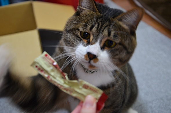 冷蔵庫から取り出した音を聞きつけて颯爽とやってきます
