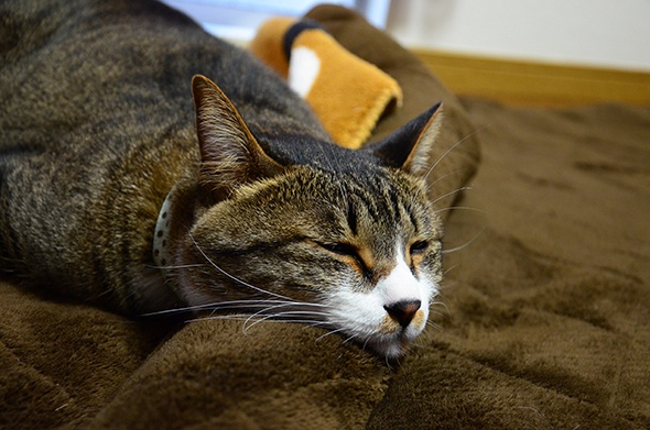 コタツの敷布団の上で大暴れして遊んでできた折り目を上手く枕にしています