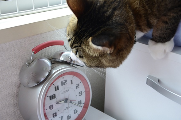 と思っていたら、突然目覚まし時計のニオイを嗅ぎだしました