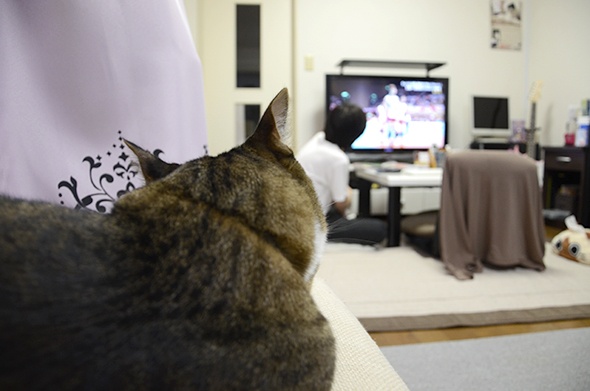 いつもはスポーツとか見ないのに、たまたまバレーボールを見ているの図