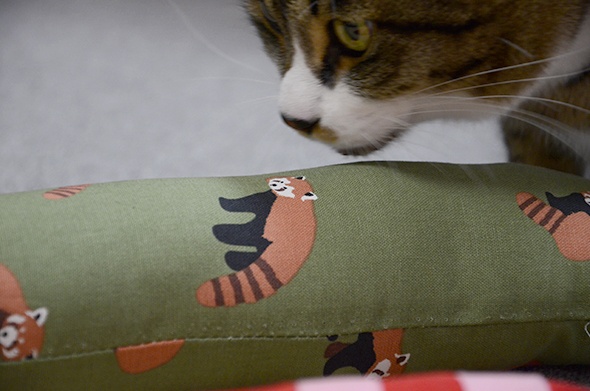 布を筒状に縫って、中にわたとまたたびを詰め込みます(`・ω・´)