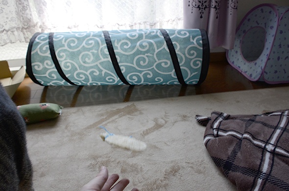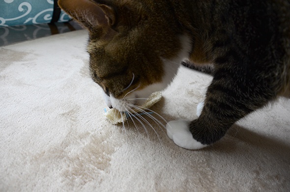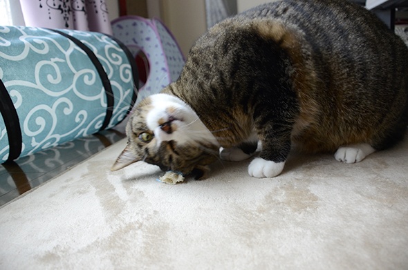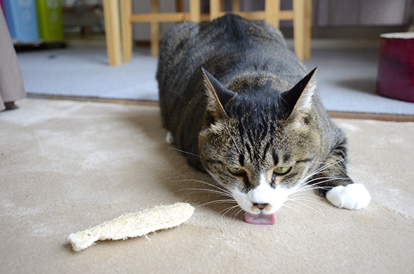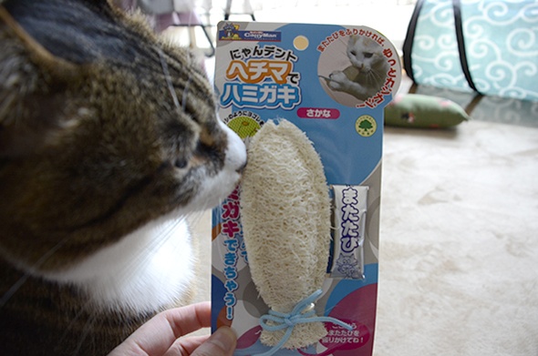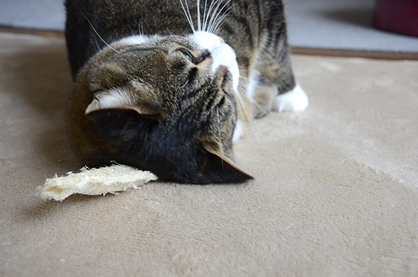 しょうがないので、ヒモを取って表面にマタタビをなすりつけてみました