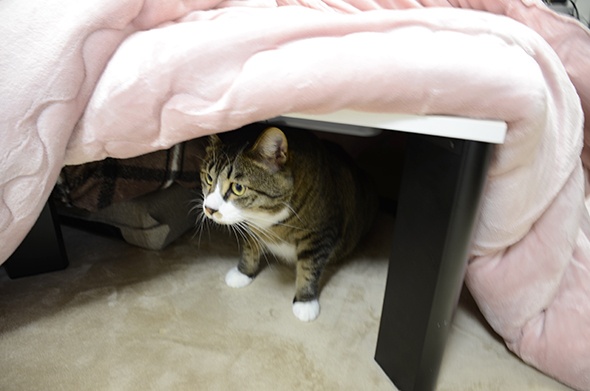 このテーブルはフラットヒーターで足元広々・・・ってもう入ってる!