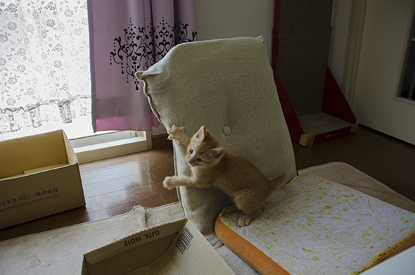 前回、座椅子の背によじ登った虎辰ですが
