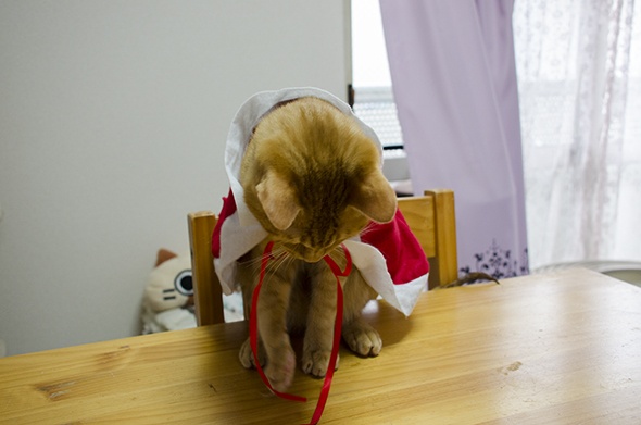 前で結んでるヒモで遊んじゃって上手く撮れません