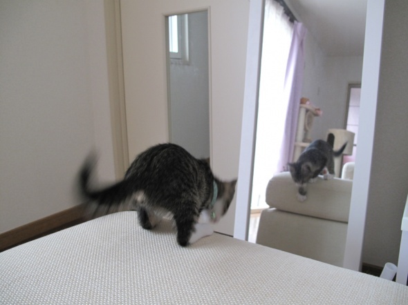 どうやら、鏡の向こうに何か居ると思っているようで、
