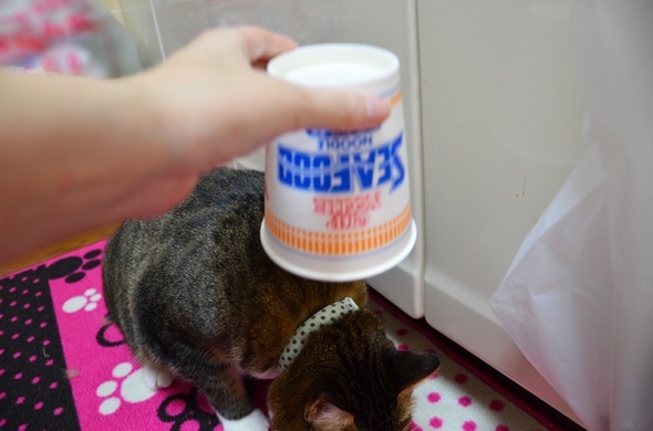 食べ終わった容器を半蔵にかぶせてみたくなったので、洗って乾かしました