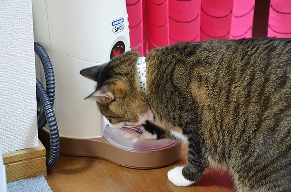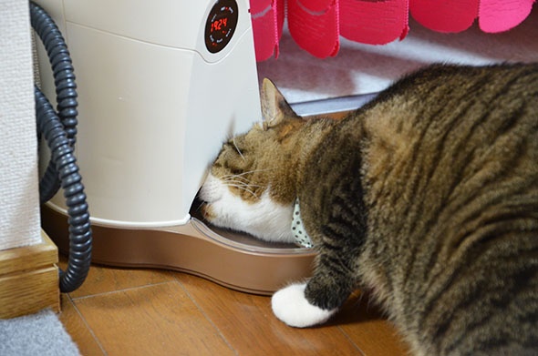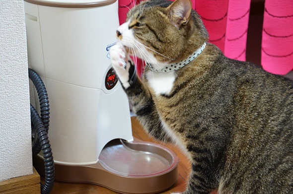 このように自動給餌機を揺するくらいご飯を減らさないと減量できないと